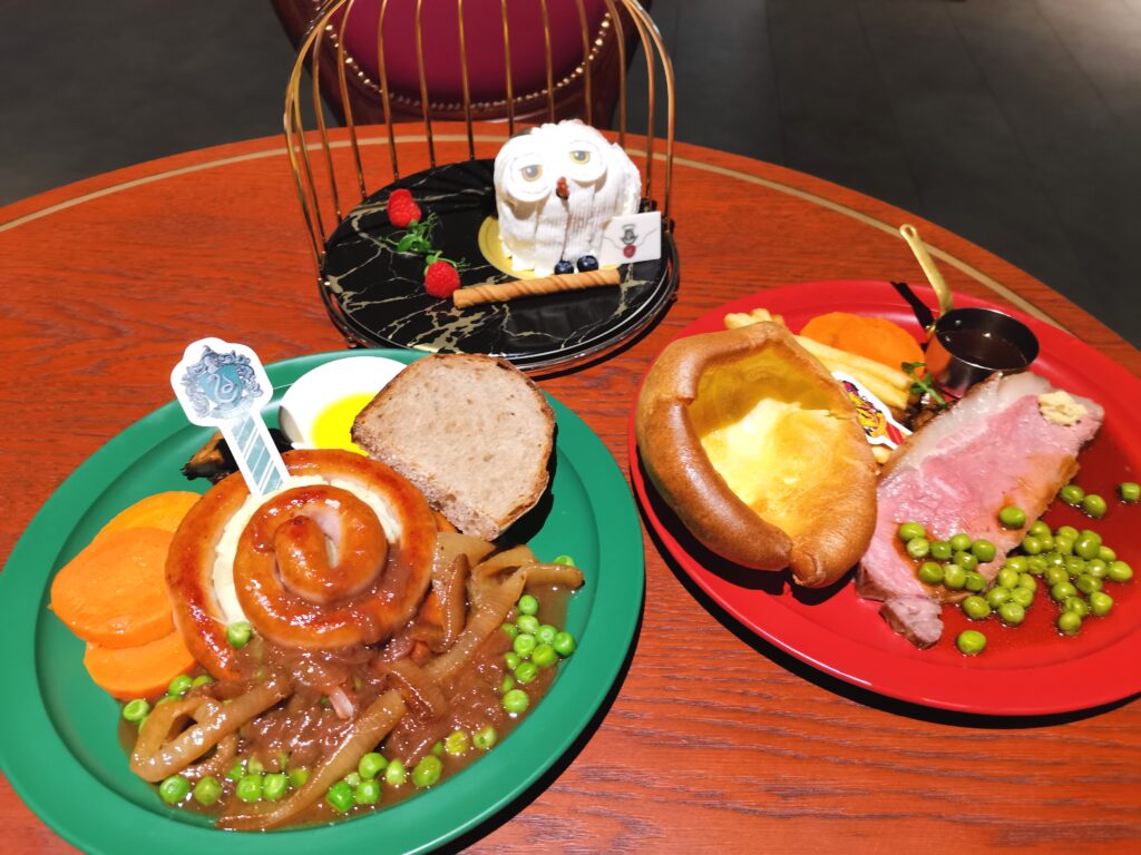 ↓各寮のプレートミール(ここではグリフィンドールとスリザリン)とヘドウィグケーキ