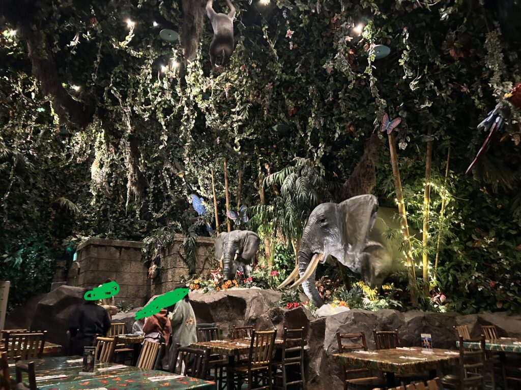 店名の通り熱帯雨林をイメージした広い店内です。時々嵐のような演出、動物が動き出す演出などもありテーマパークのような雰囲気です。