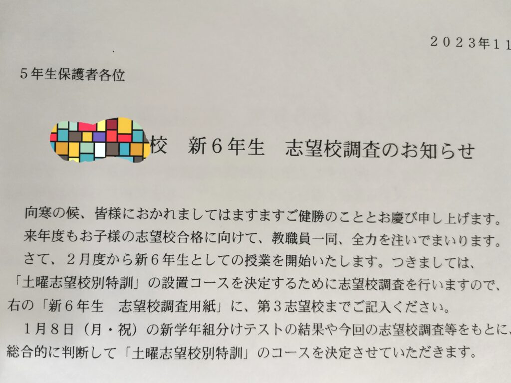 受け取ったのは「新6年生 志望校調査用紙」でした↓