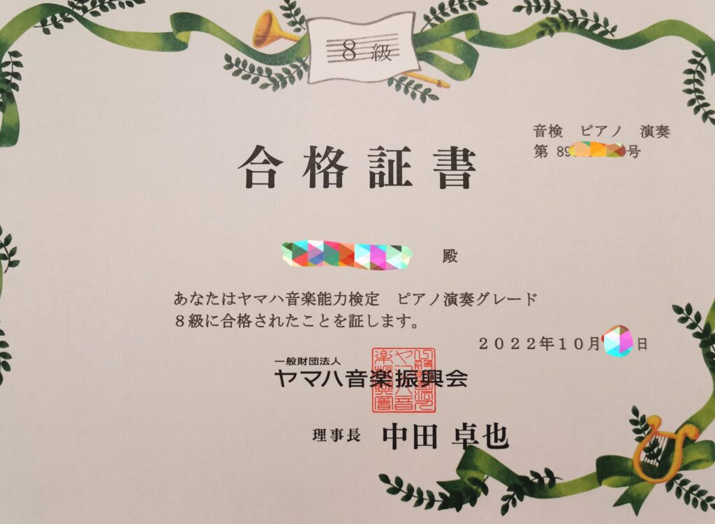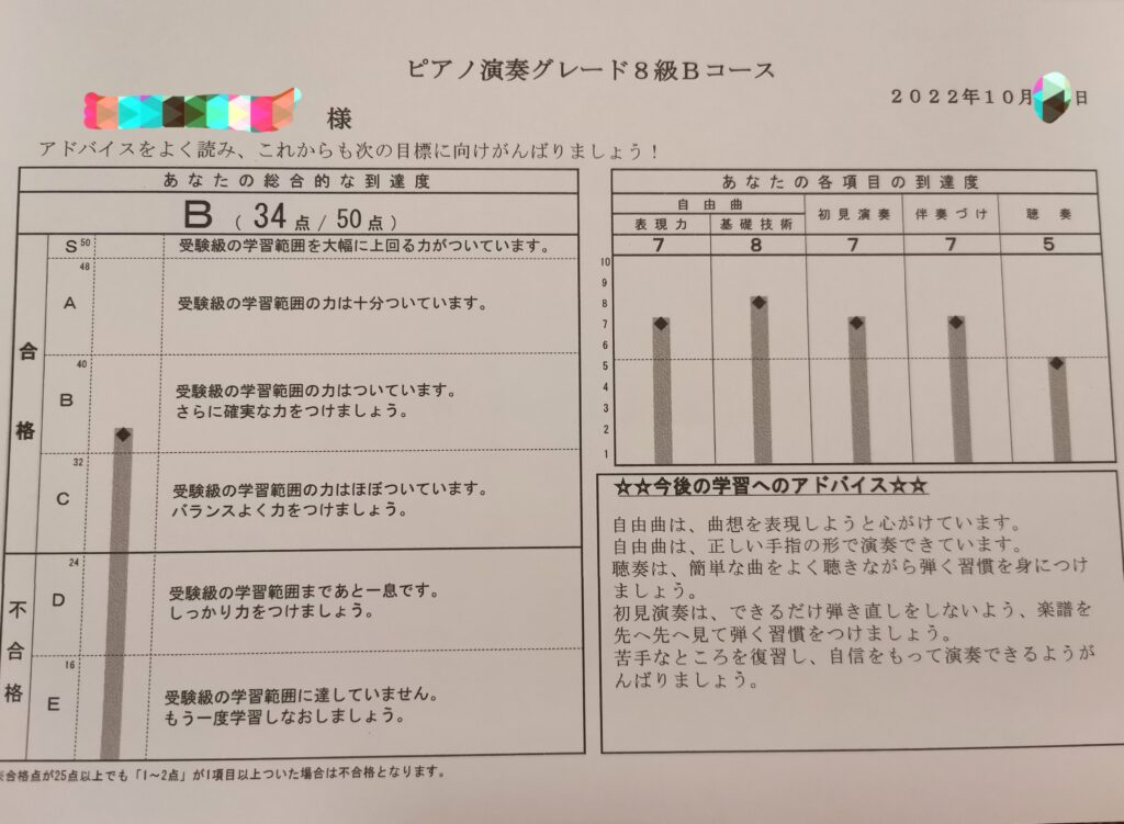 10月に受けたグレードテスト8級、2週間で結果が届きました。