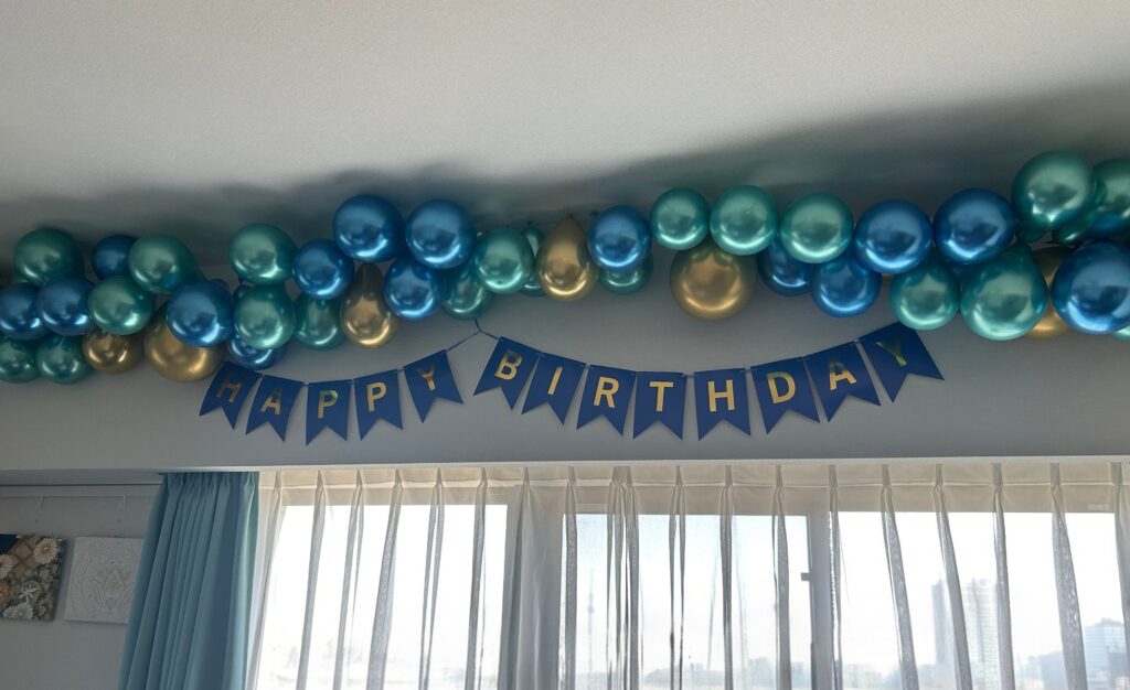 リビングのインテリアになじむよう青・緑・ゴールドとしました。いずれも照りのある質感で満足。バルーンはそれほど広くない壁面ですが、合計50個使いました。