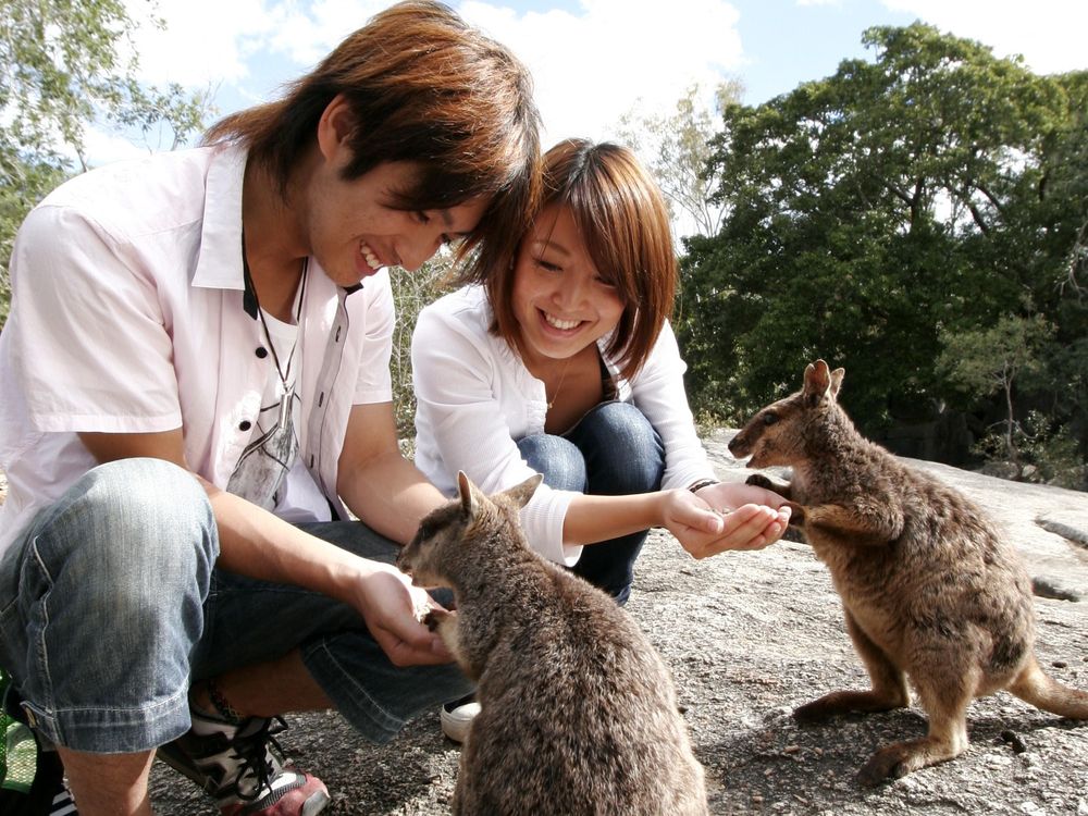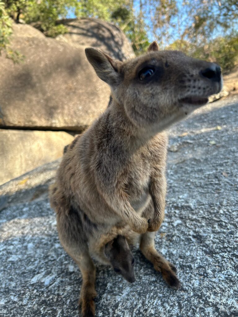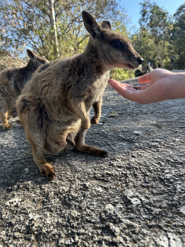 車で立ち寄ったグラネット渓谷(GRANITE GORGE)のキャンプ場ではワラビーちゃんへの餌えりが可能でした。人馴れしてます。お腹の袋に赤ちゃんが見え隠れして、とても可愛かったです。