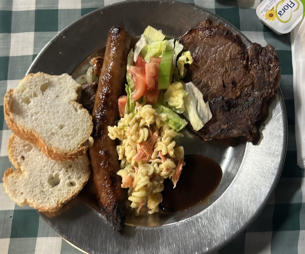 キャンプサイトに着いて、夕食です。スタッフの方がBBQして下さったお肉をいただきます。